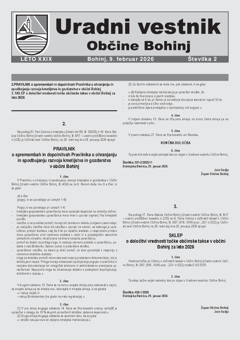 Pravilnik o spremembah in dopolnitvah Pravilnika o ohranjanju in spodbujanju razvoja kmetijstva in gozdarstva v občini Bohinj (Številka 2/2026)
