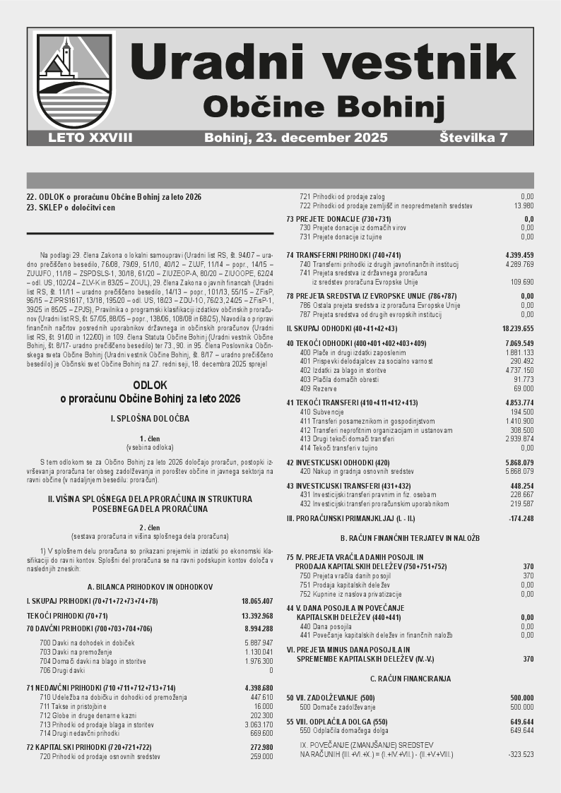 Odlok o Proračunu Občine Bohinj za leto 2026 (Številka 7/2025)