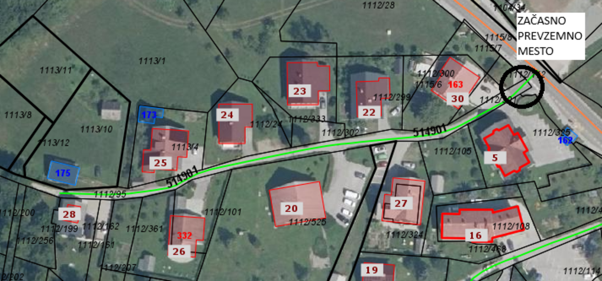 V tem času bo odvoz odpadkov (mešani komunalni odpadki, mešana embalaža in biološki odpadki) potekal po običajnem urniku, začasno prevzemno mesto pa bo urejeno ob glavni cesti. Prosimo vas, da na dan odvoza zabojnike pravočasno pripeljete na označeno lokacijo ter jih pripravite ob robu cestišča, kjer ne ovirajo prometa. Po izvedenem odvozu jih, prosimo, še isti dan odpeljite nazaj k objektu, saj dostop smetarskemu vozilu do običajnih prevzemnih mest ne bo mogoč. Režim velja le v času izvajanja del, ko bo cesta neprevozna.