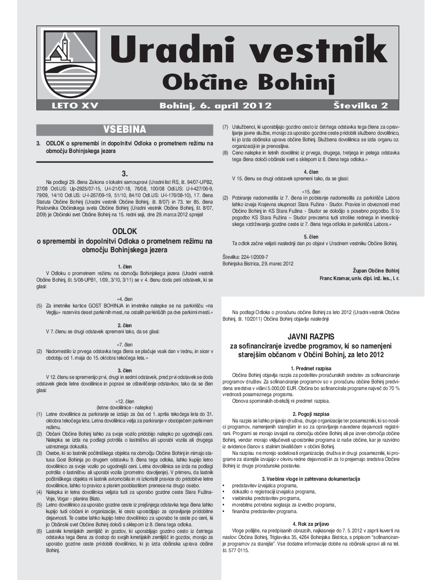 Odlok o spremembi in dopolnitvi Odloka o prometnem režimu na območju Bohinjskega jezera (Številka 2/2012)