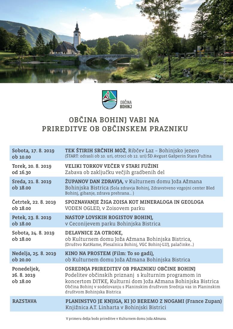 - v ponedeljek, 26. avgusta ob 18:00 - Osrednja slovesnost ob prazniku Občine Bohinj v Kulturnem domu Joža Ažmana.