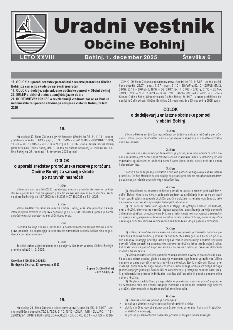 Odlok o dodeljevanju enkratne občinske pomoči v Občini Bohinj (Številka 6/2025)